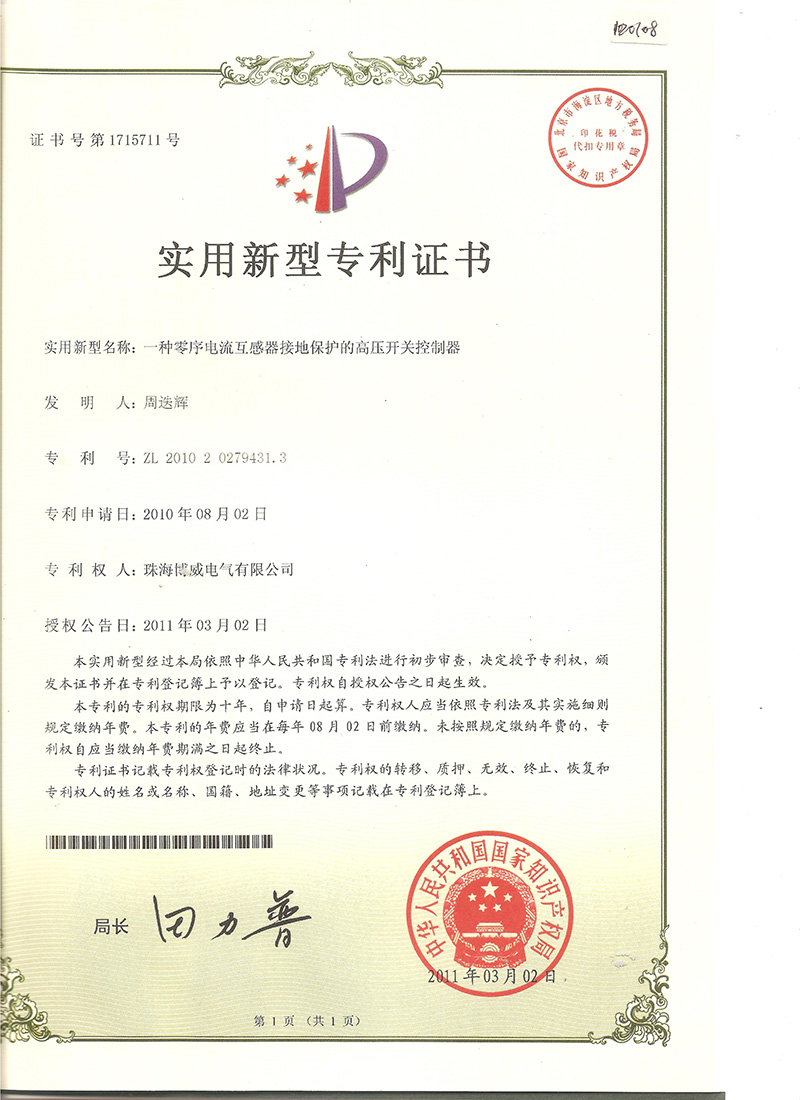 (實(shí)用新型)一種零序電流互感器接地保護(hù)的高壓開關(guān)控制器